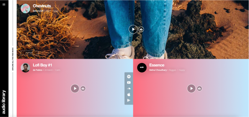 Audio Library是一个大型的免费无版权音乐平台,收集了许多可供创作者使用的高质量音乐。大家可以通过网站左上角的按钮,按照流派、情绪和音乐人三个维度来查找特定音乐。